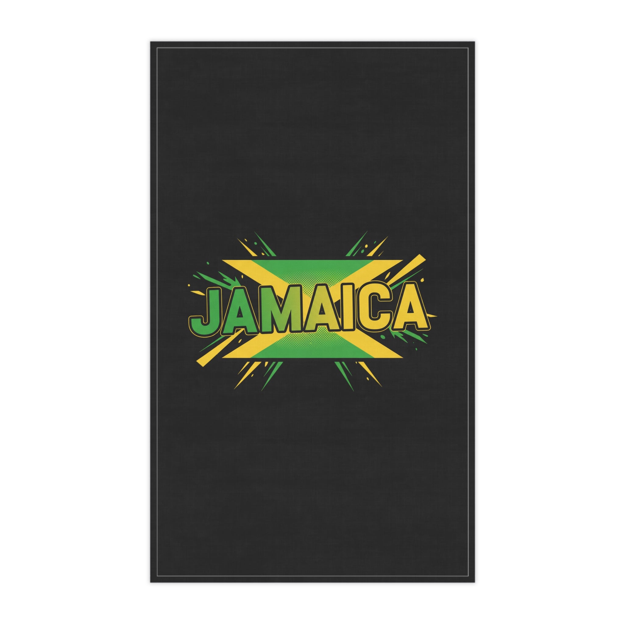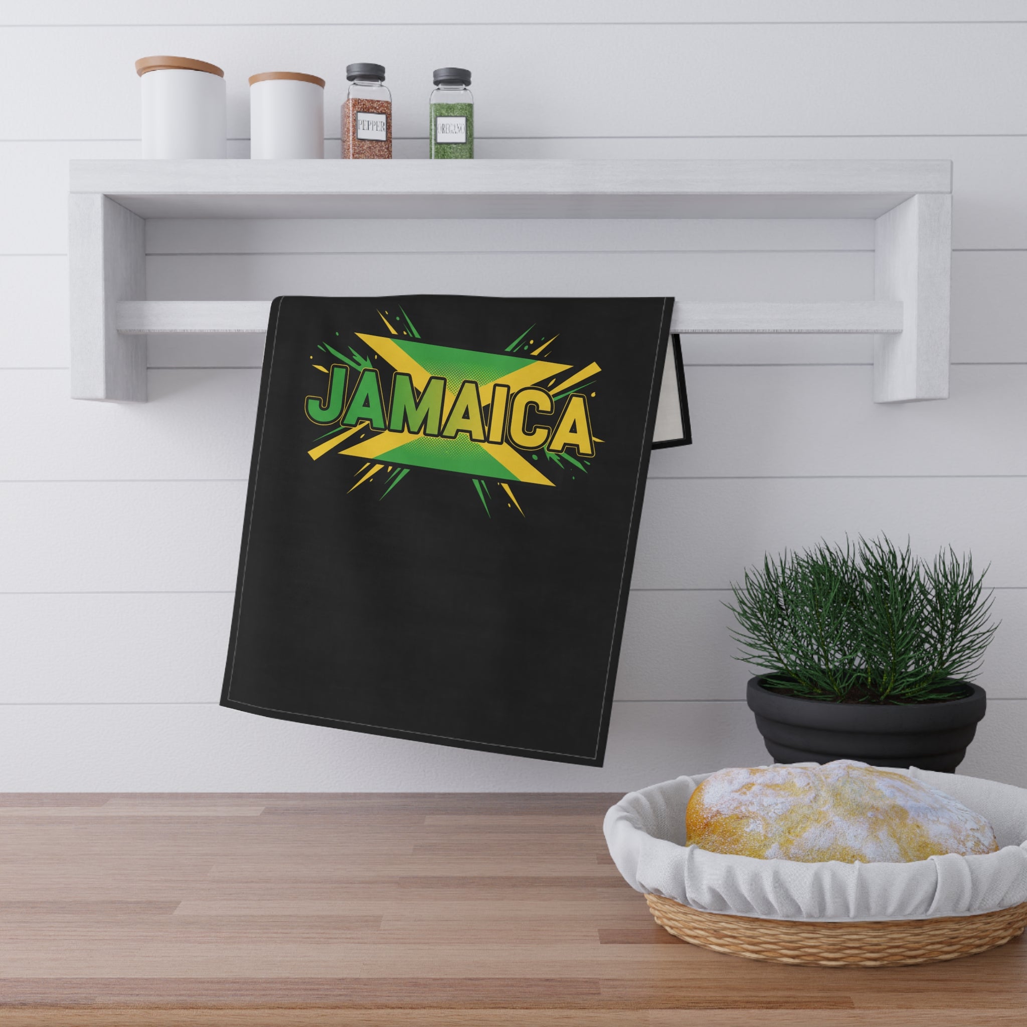 Fold it over the oven handle and let it speak: this tea towel carries a bold Jamaica graphic—green and gold bursting against a deep black field. It brings a relaxed, sunlit energy to routine kitchen moments: drying dishes, wiping counters, or lining a basket of warm bread. The print has a slightly retro, poster-like punch that suits someone who loves bright island colors and casual, lived-in style. Lightweight and neatly hemmed, it feels easy to toss in with dishware or use as a decorative accent on a shelf or hook. Leave it out where it can be seen—its friendly, punchy lettering becomes part of the room’s rhythm and invites a small, everyday smile.
