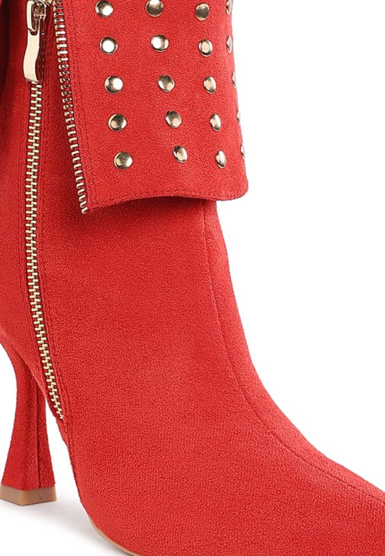 The foldover boots have an edgy flair with the stud embellishments and a trendy, fun element with the foldover detail. The zipper fastening is convenient, while the soft cushion insoles cut strain. Pair these with your most ravishing outfits for a glamorous and bold ensemble.