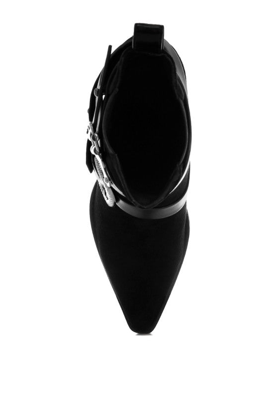 Attain a chic cottagecore look with these microfiber closed snip toe boots. The strap detailing adorned with buckles add to the aesthetics while the angular block heel bring in a touch of whimsy. Team these with your midi dresses for a Boho-inspired ensemble.