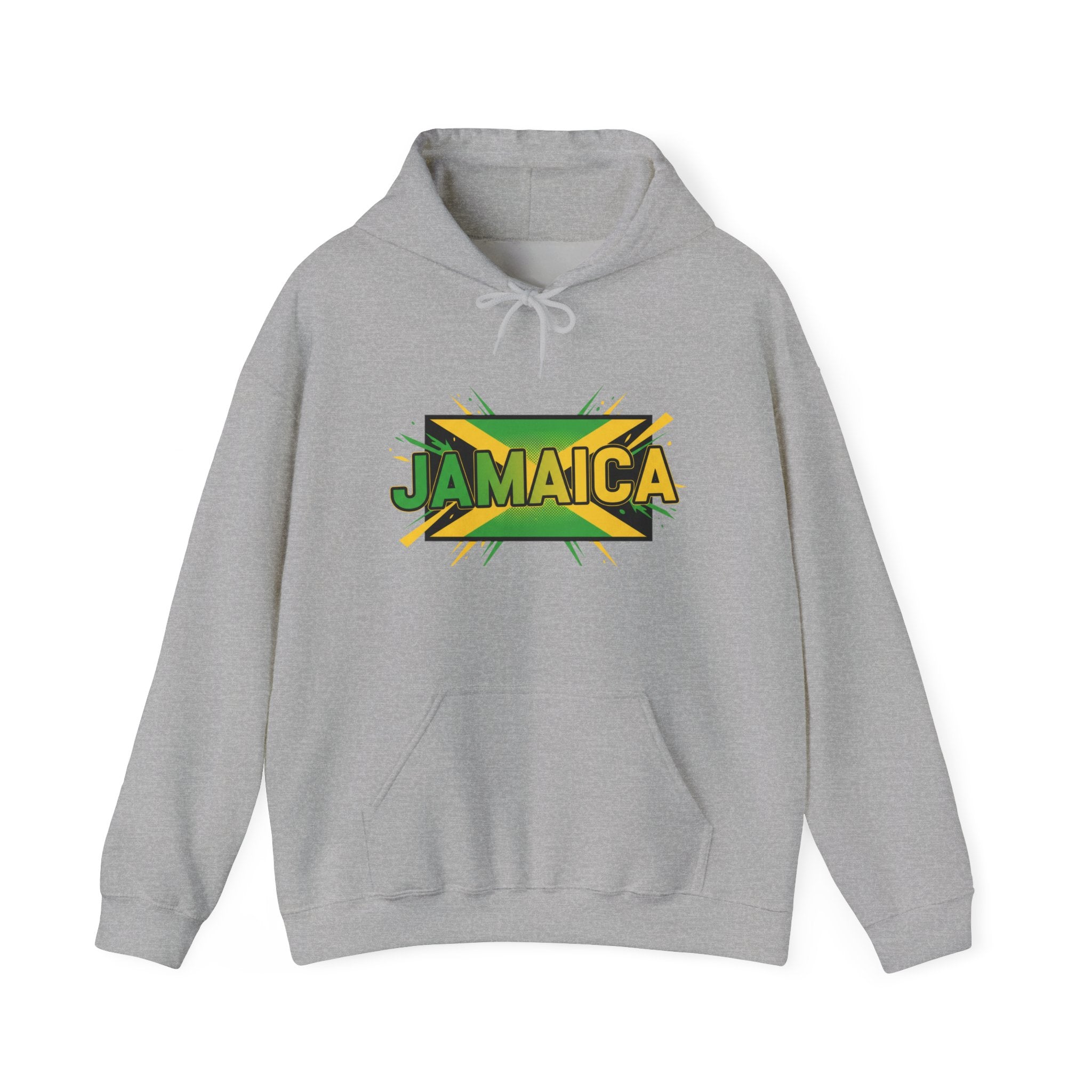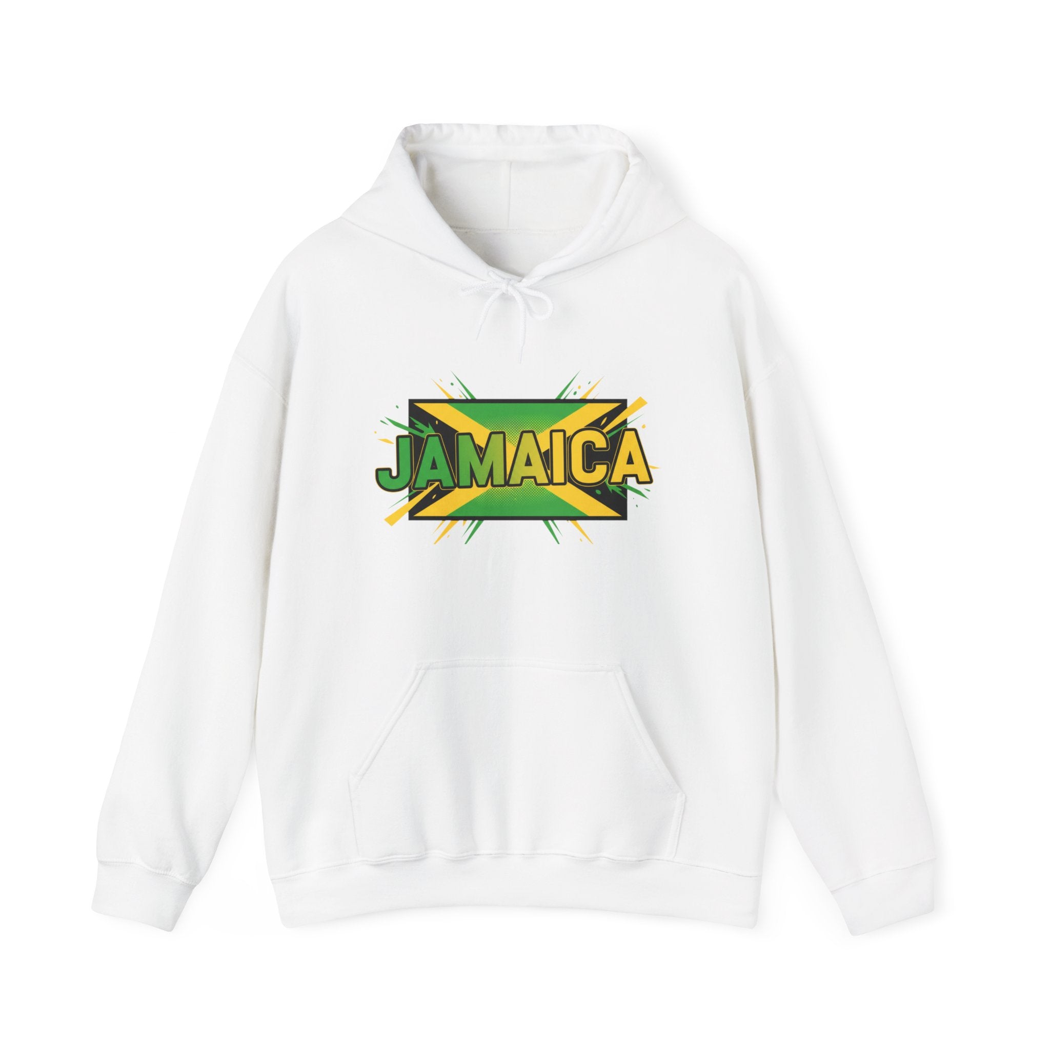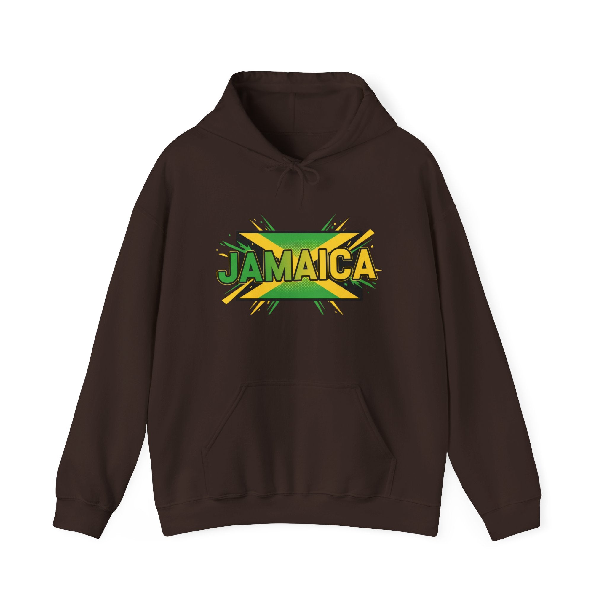 This cozy hoodie carries a bold, sun-soaked Jamaica graphic across the chest — bright greens, golds, and black layered with a slight distressed edge for a lived-in vibe. It feels warm and substantial without being bulky. Slip your hands into the roomy kangaroo pocket, pull the double-lined hood up with its matching drawcord, and settle into a quiet morning of coffee, reggae on the speakers, and plans for the day. Made to be worn casually around town, on travel days, or at low-key gatherings, it blends island energy with everyday comfort so the wearer can carry a bit of Jamaica wherever they go.