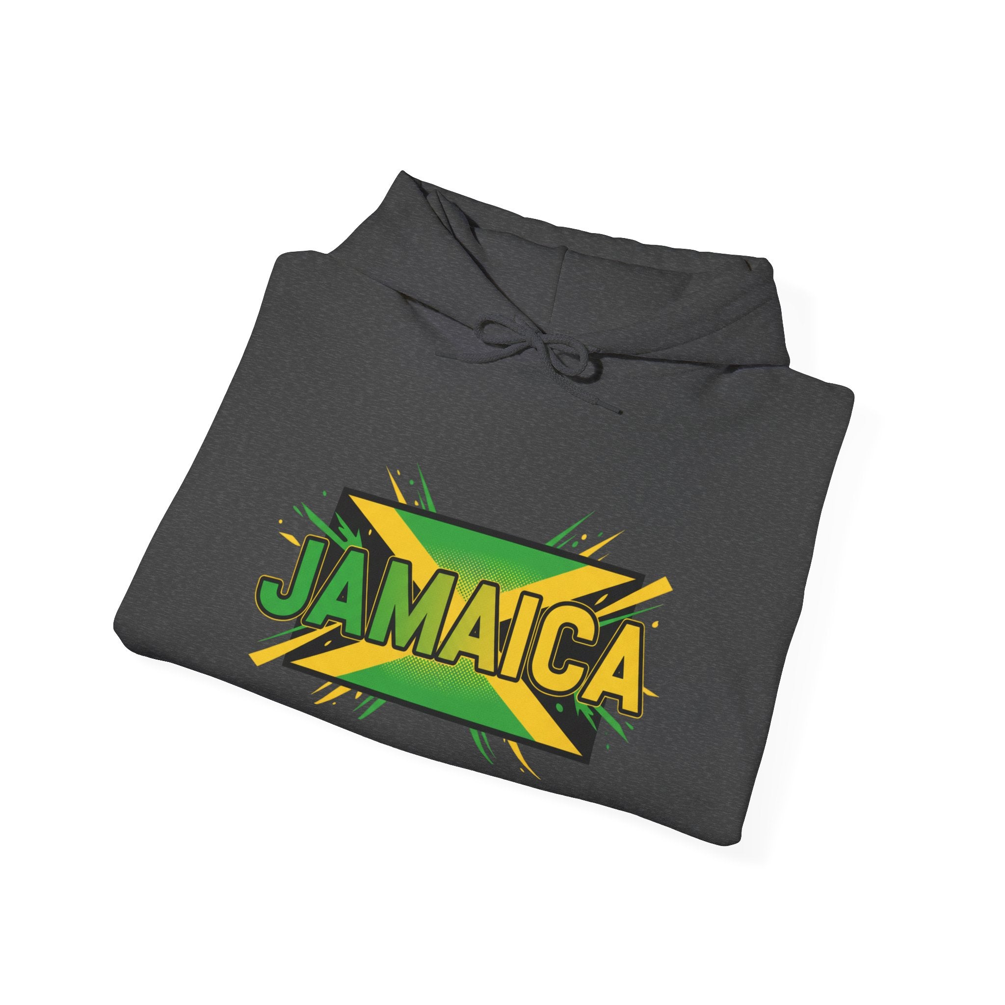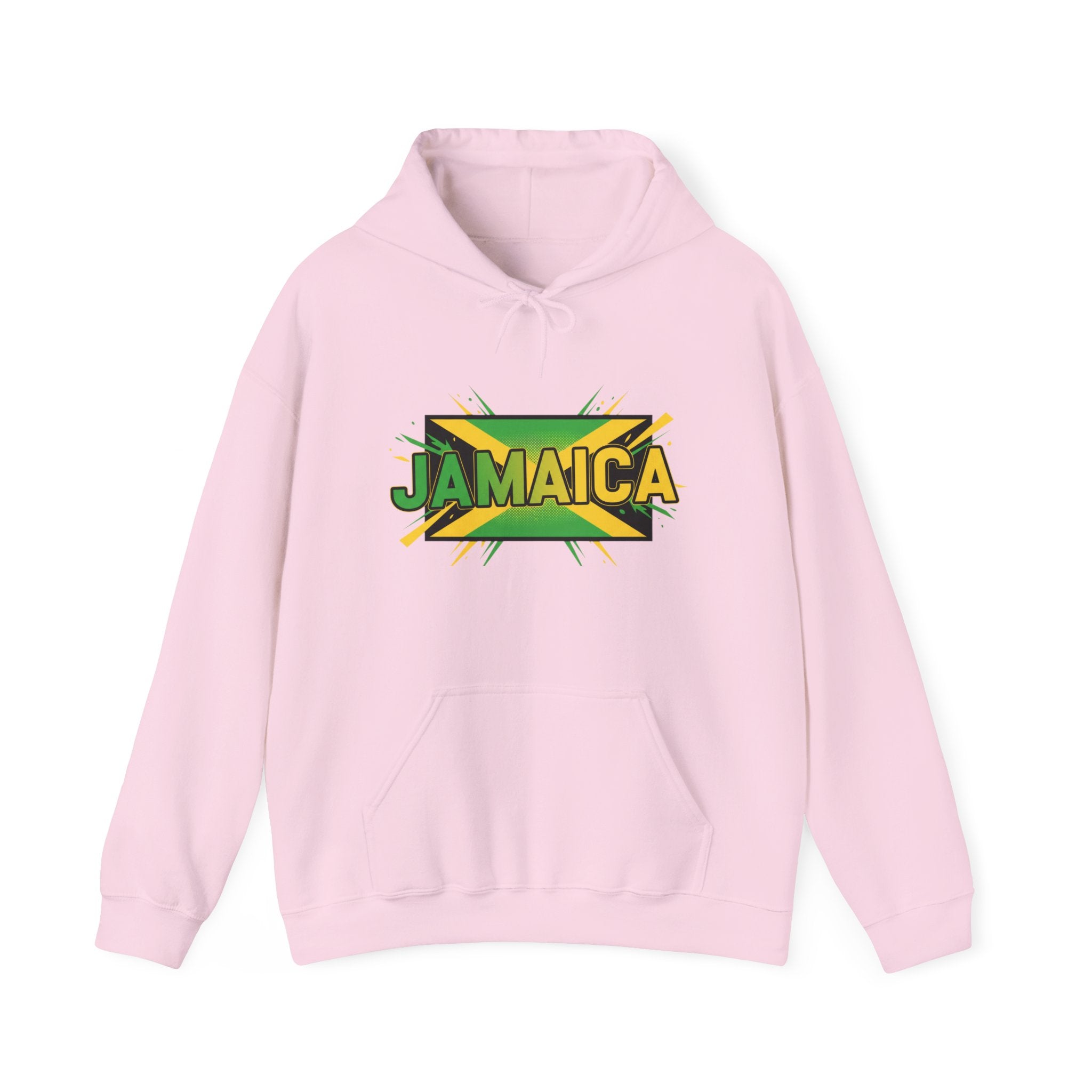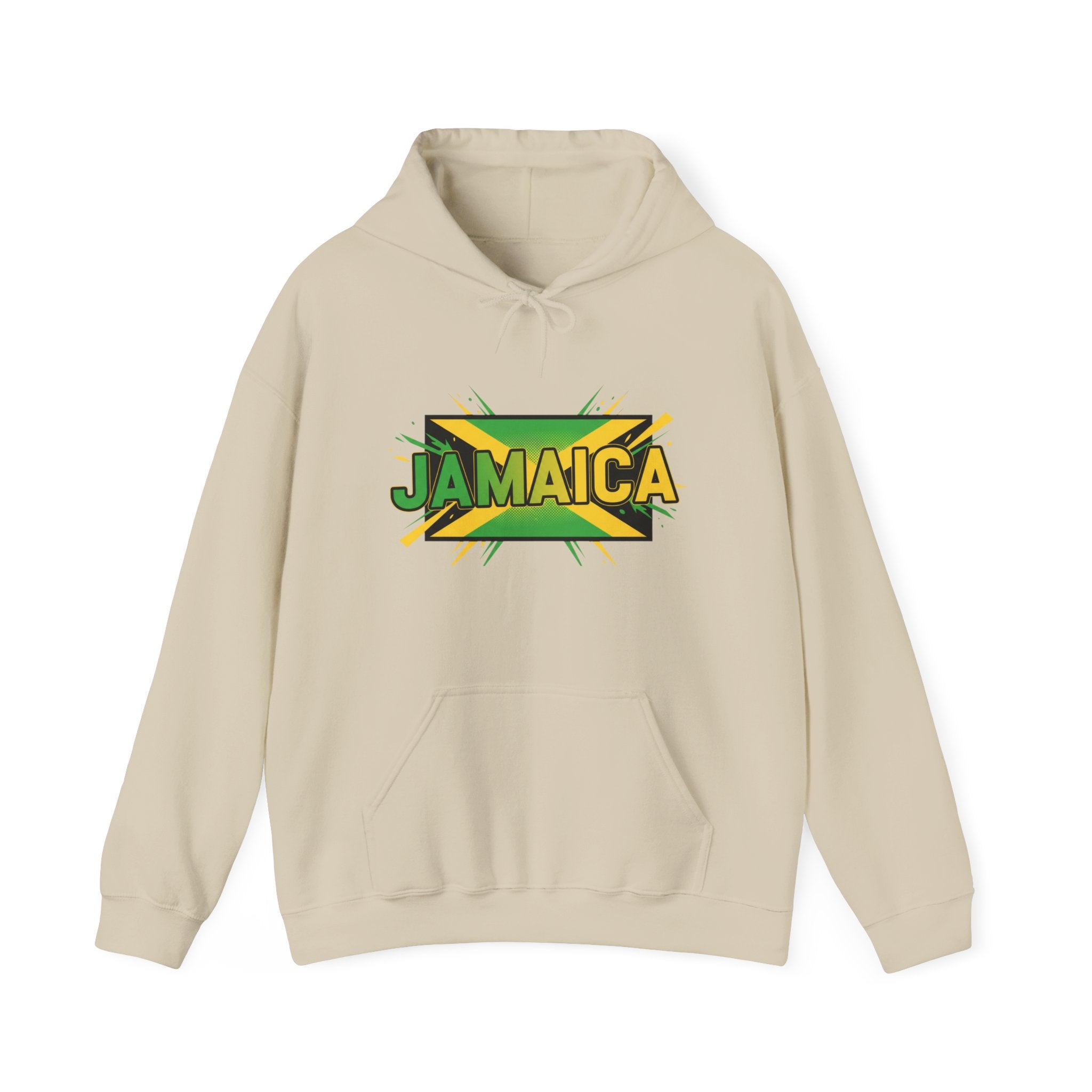 This cozy hoodie carries a bold, sun-soaked Jamaica graphic across the chest — bright greens, golds, and black layered with a slight distressed edge for a lived-in vibe. It feels warm and substantial without being bulky. Slip your hands into the roomy kangaroo pocket, pull the double-lined hood up with its matching drawcord, and settle into a quiet morning of coffee, reggae on the speakers, and plans for the day. Made to be worn casually around town, on travel days, or at low-key gatherings, it blends island energy with everyday comfort so the wearer can carry a bit of Jamaica wherever they go.