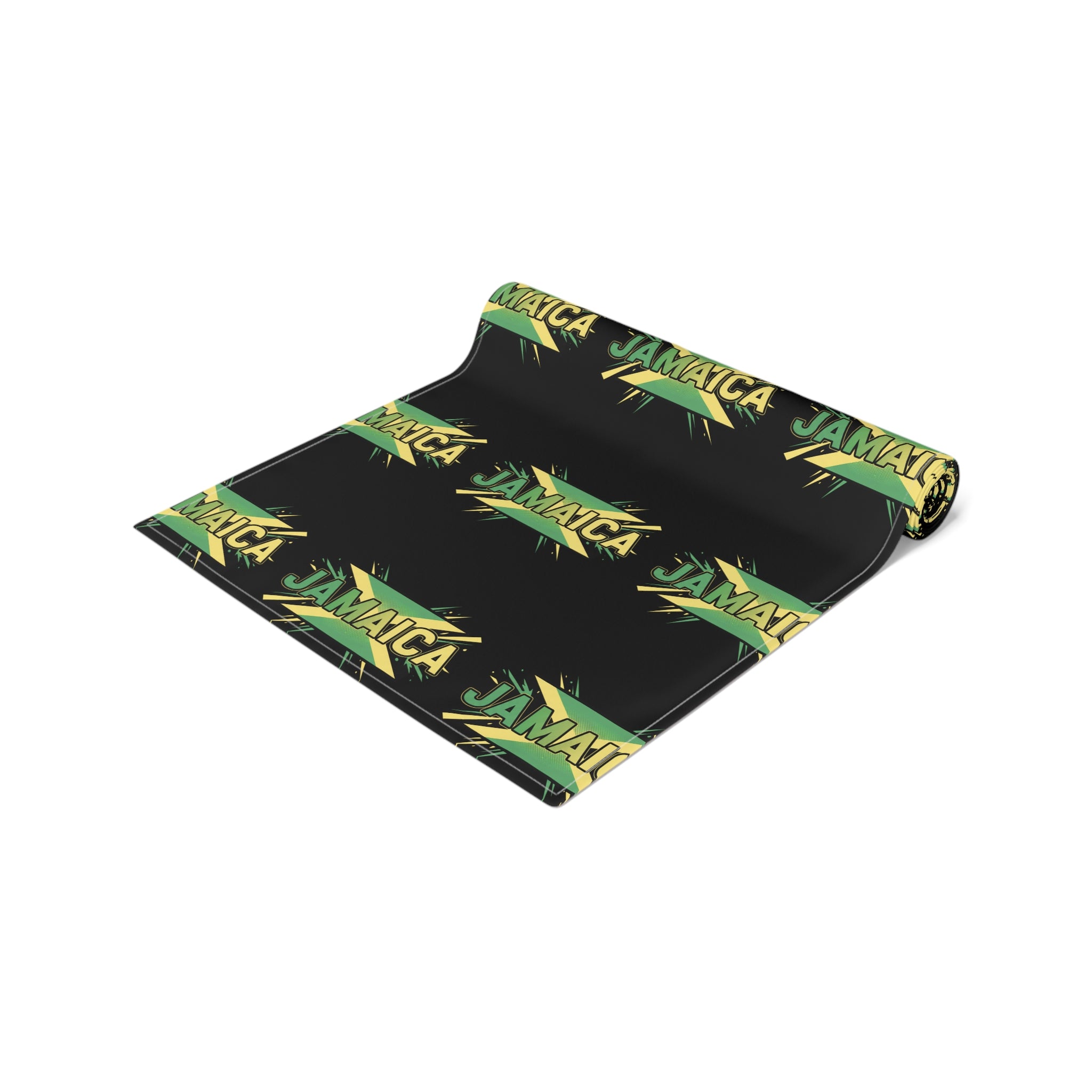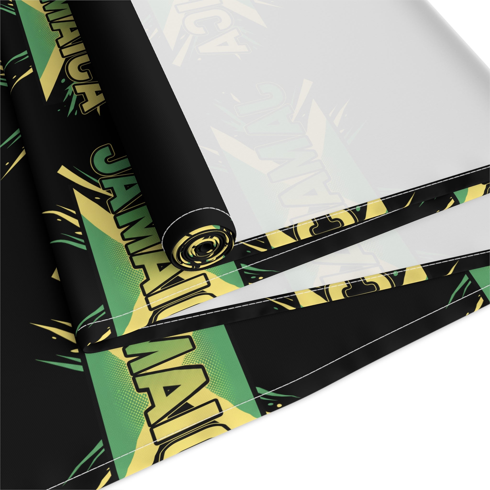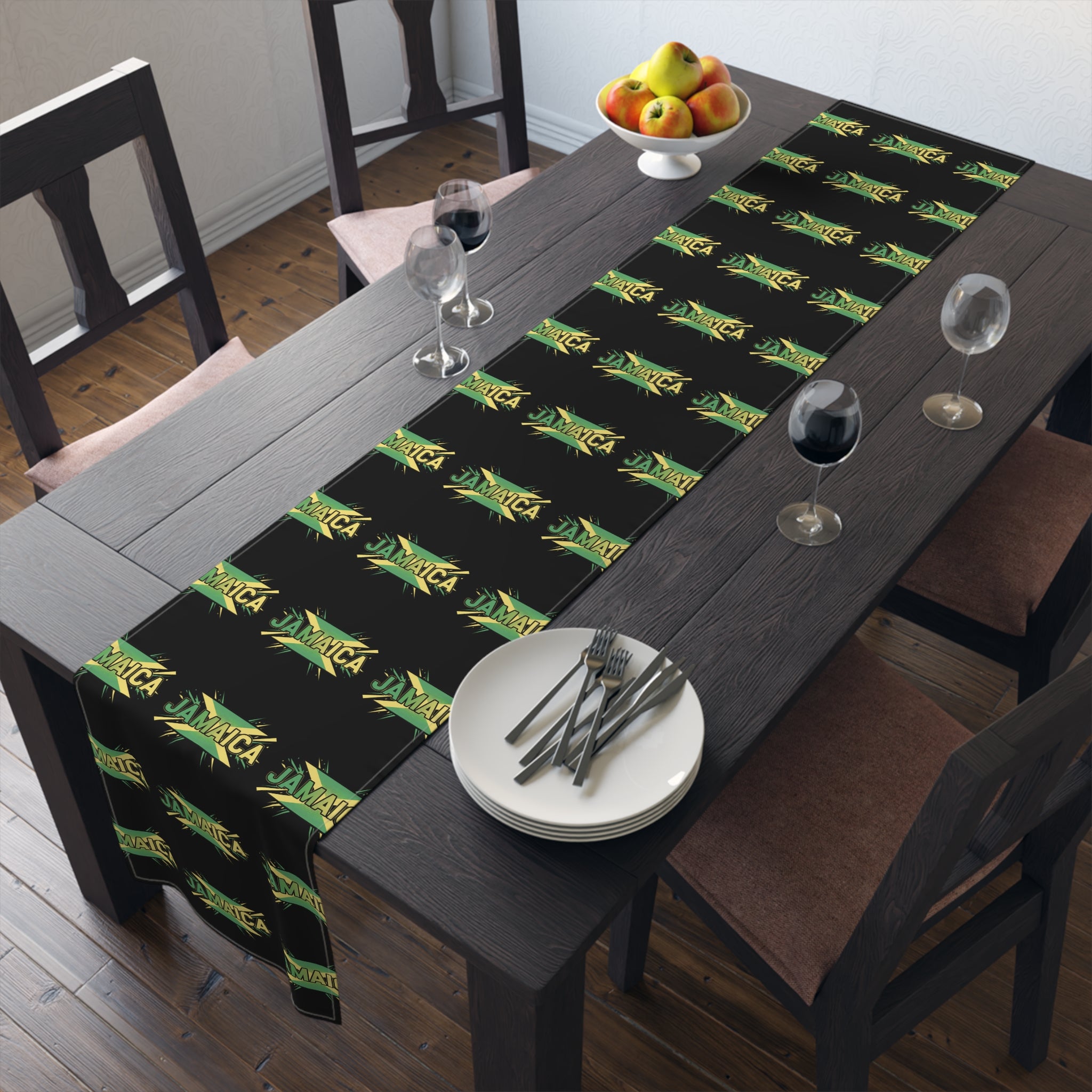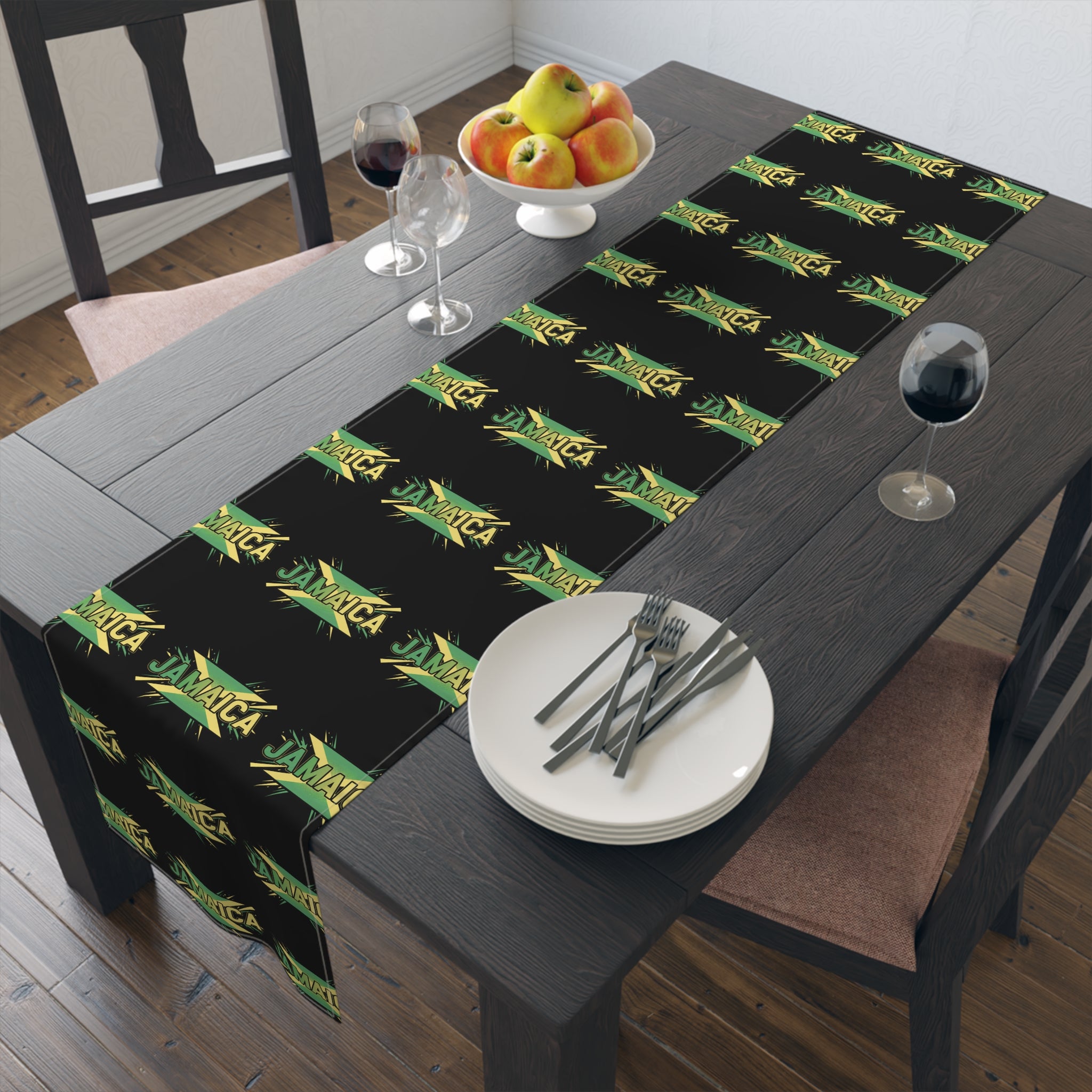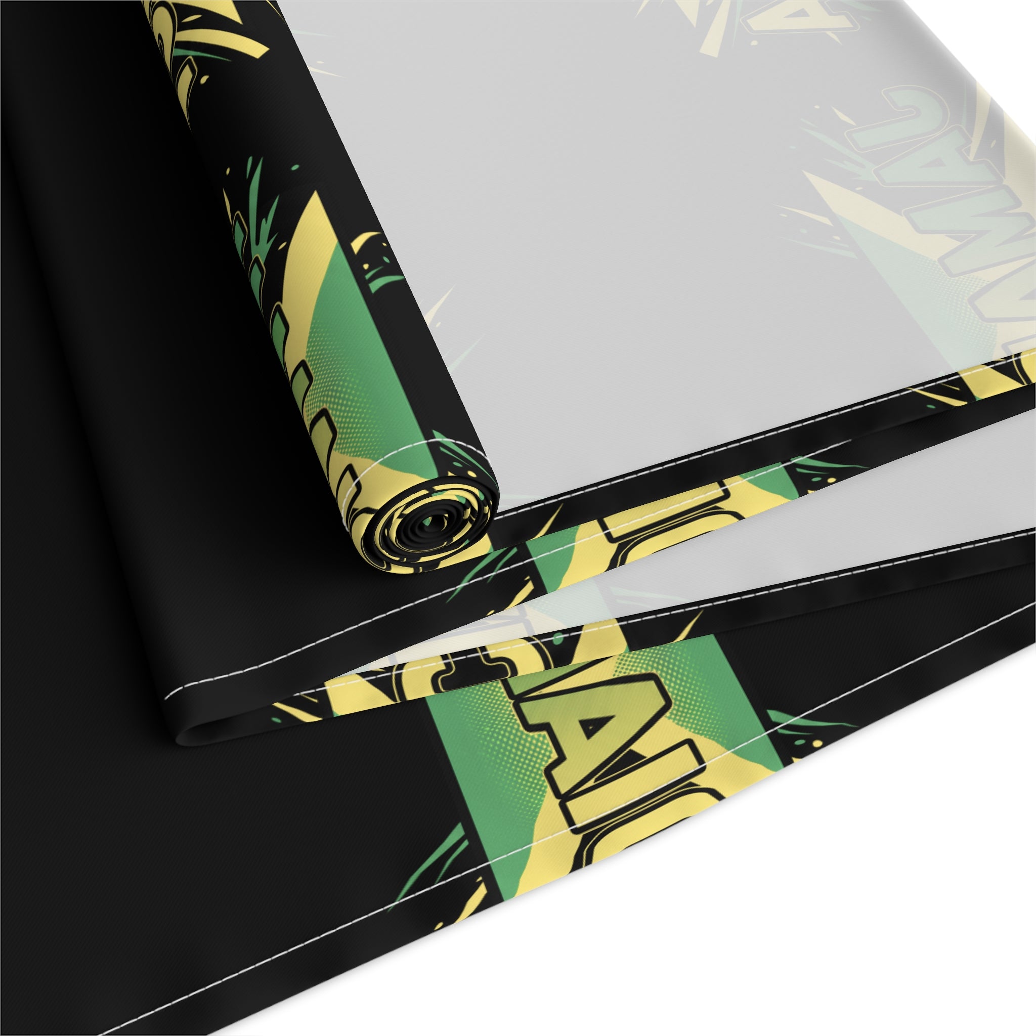 This vibrant table runner brings island energy to your dining table with bold green and gold lettering against a deep black field. It lays long and confident down the center of a table, turning everyday meals into a bright, celebratory moment. Choose the quick-drying polyester for vivid, saturated color that resists wrinkles, or opt for the cotton twill for a softer, more traditional look with a subtle, muted print. Hemmed edges add structure and keep the runner looking neat through repeated use. Use it for casual gatherings, themed dinners, or when you want a touch of laid-back tropical spirit at your next get-together.