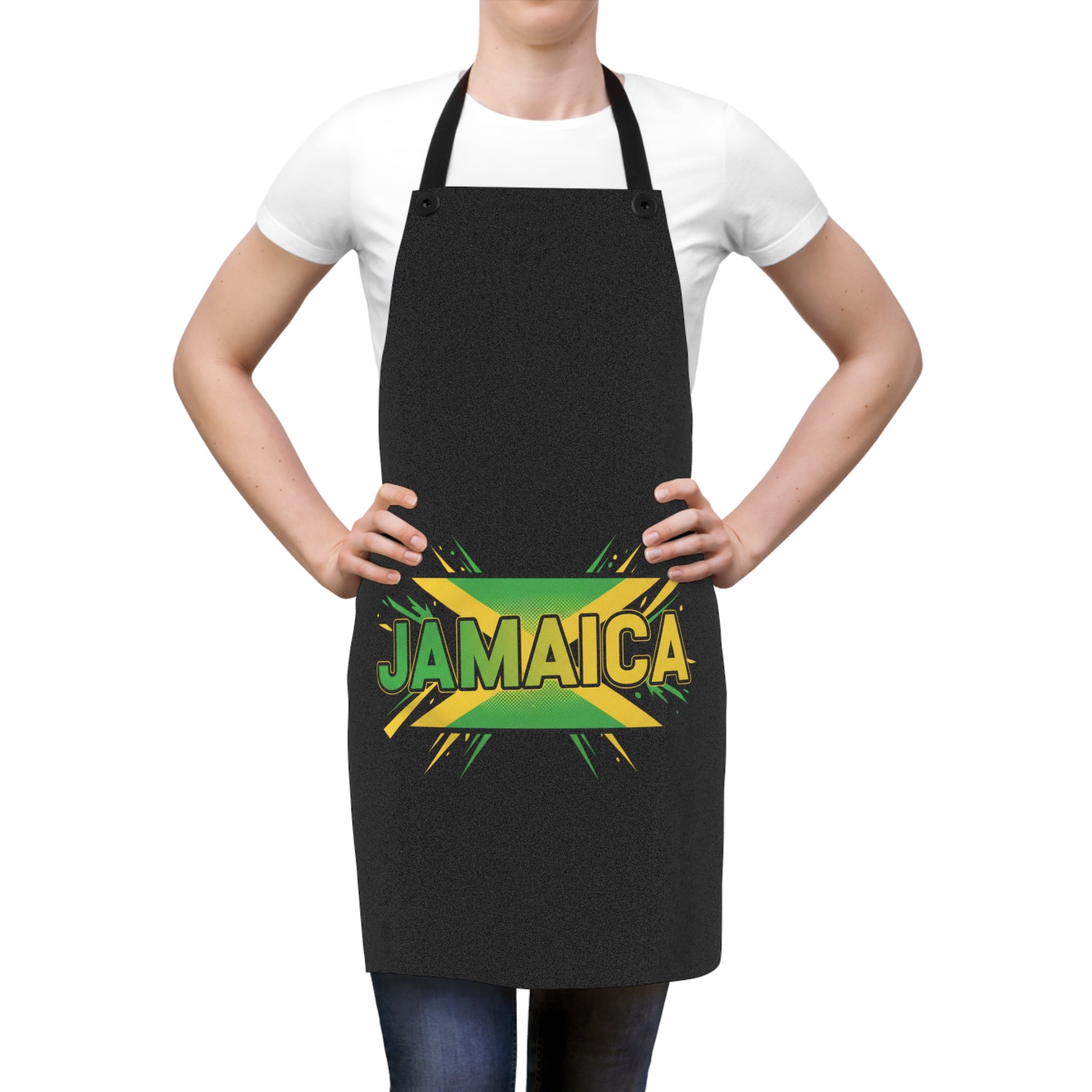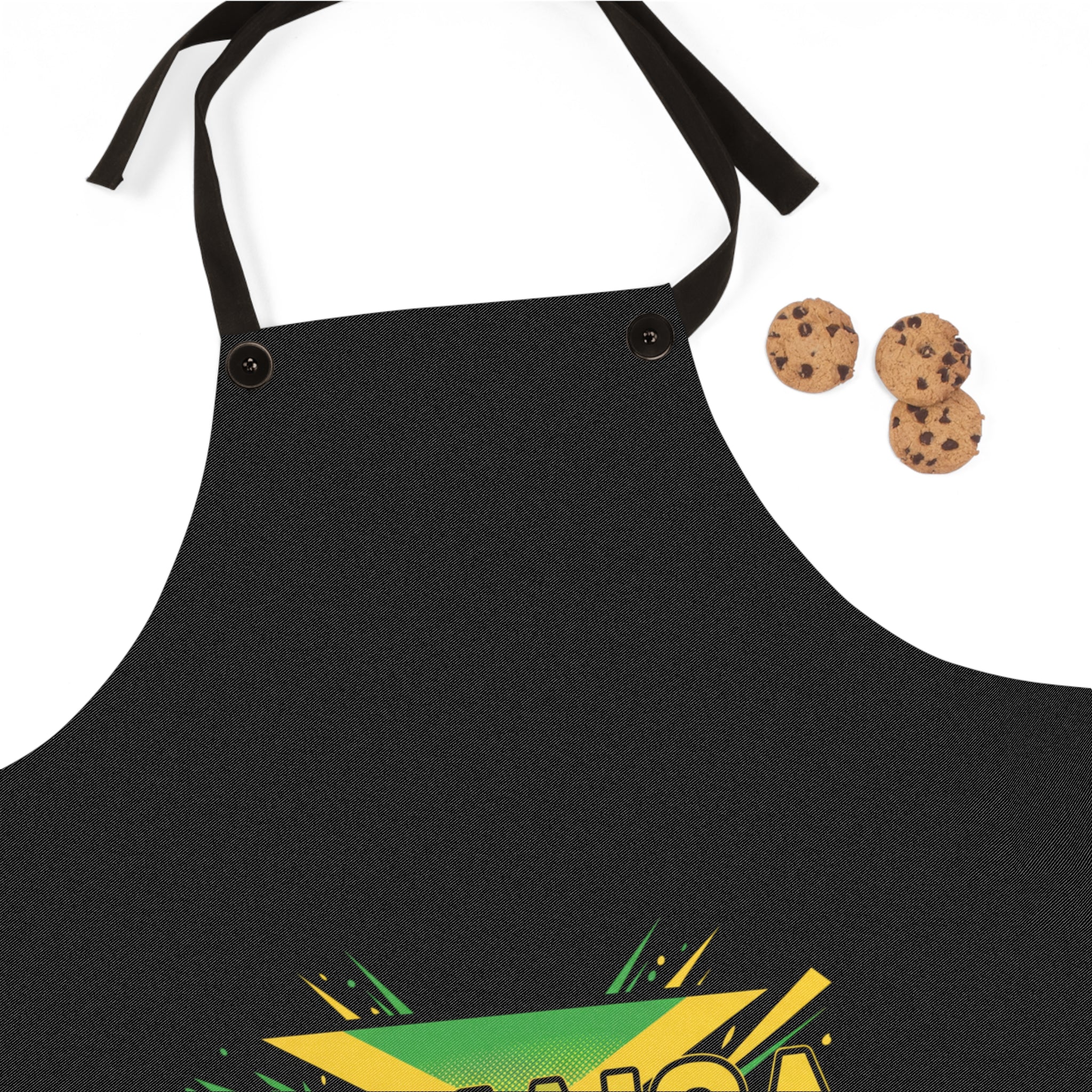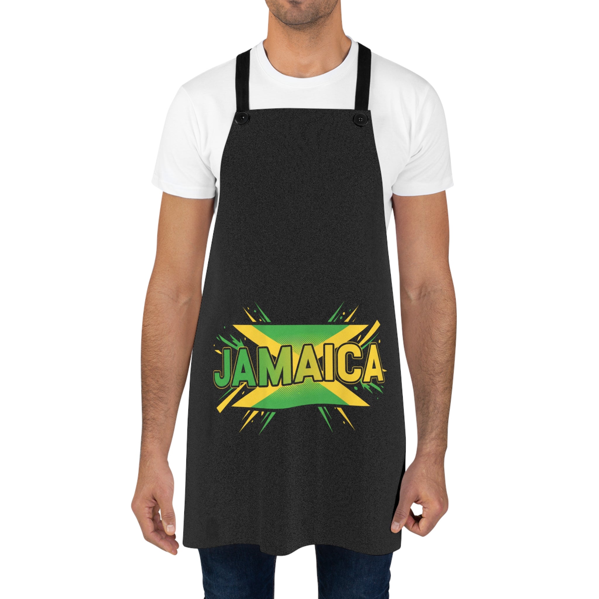 Bring a burst of island energy into your kitchen with this sturdy printed apron. The bold Jamaica graphic sits low on a durable black canvas, offering a pop of color that feels lively without shouting. Lightweight polyester stands up to spills, dries fast, and keeps its shape through long cooking sessions or backyard grill nights. The detachable black twill straps and four buttonholes let you adjust the fit quickly, while reinforced overlocked seams mean this apron can take everyday wear in stride. Wear it while mixing jerk seasoning, tending a barbecue, or teaching friends to bake — it makes the room feel warmer and more playful.