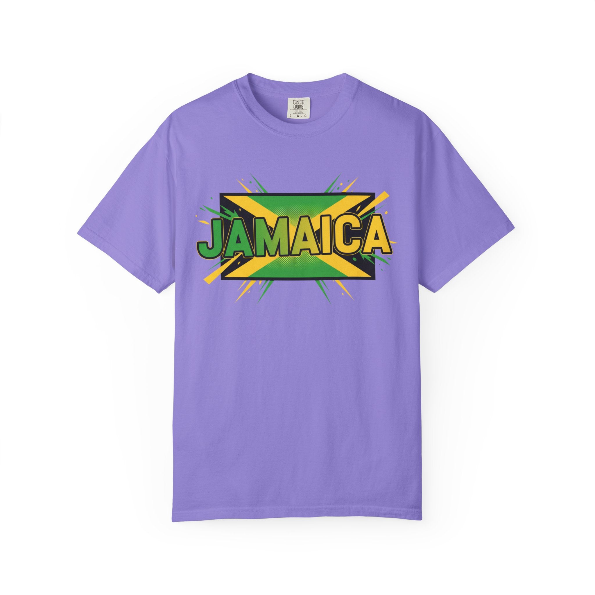 Sun-washed and worn-in from day one, this garment-dyed tee carries the laid-back energy of island streets. The bold “Jamaica” graphic pops with green, gold, and black — colors that feel like vinyl playlists, sunlit beaches, and loud laughter at dusk. The heavy 100% cotton drape and relaxed fit settle easily over jeans or boardshorts; it ages softly with every wash so the shirt becomes more personal over time. Wear it to backyard cookouts, reggae nights, or long drives with the windows down — it’s made to feel like a lived-in favorite, not a showroom piece.