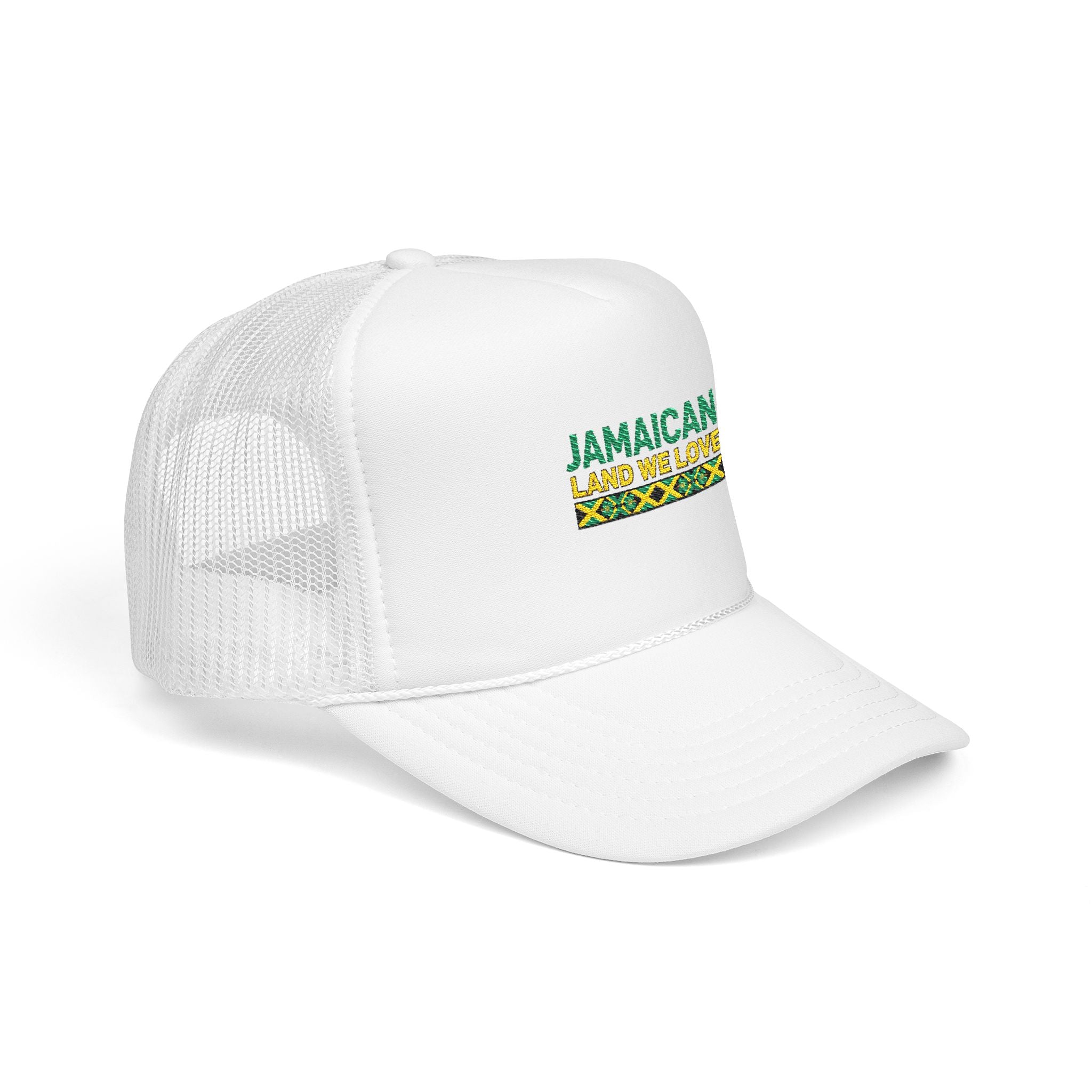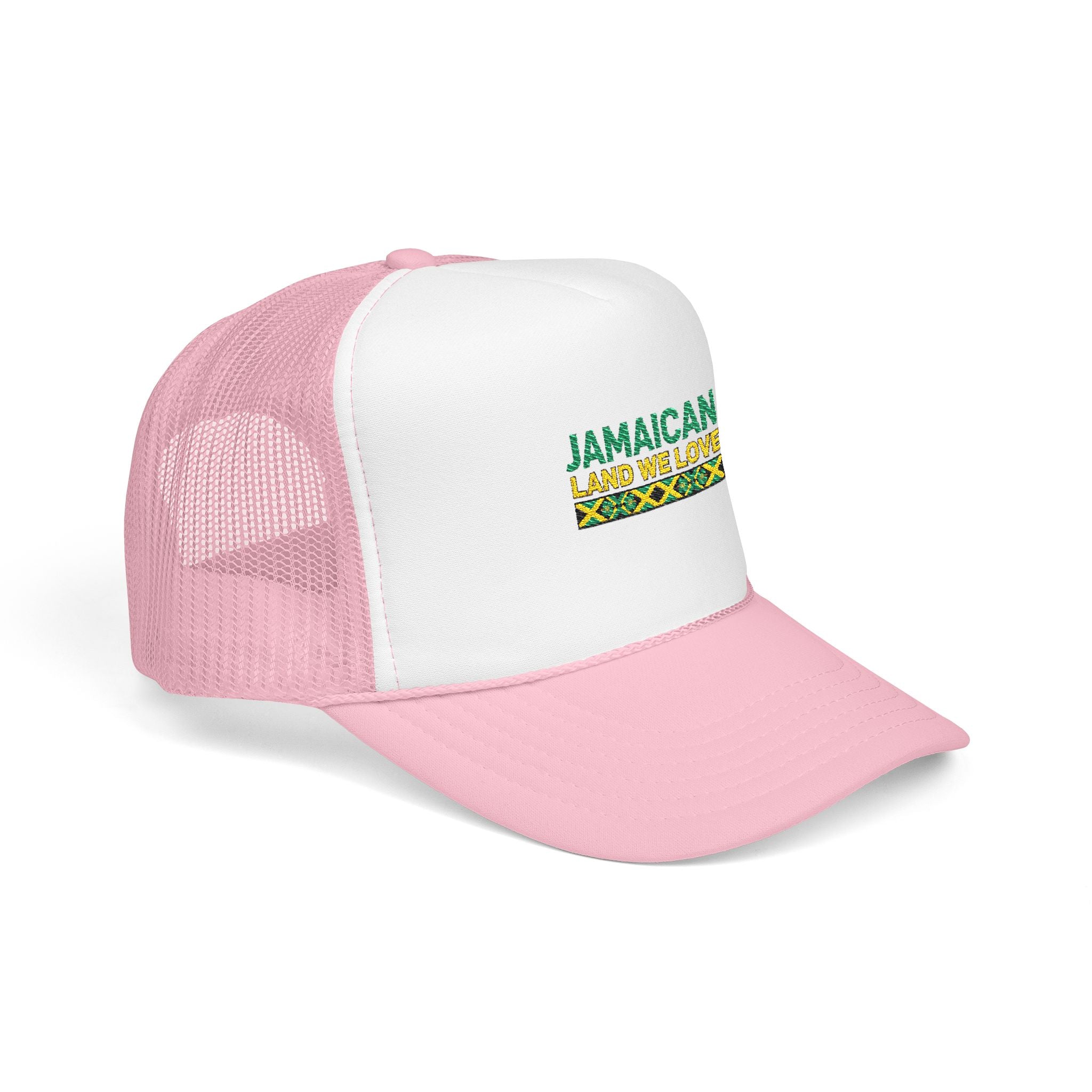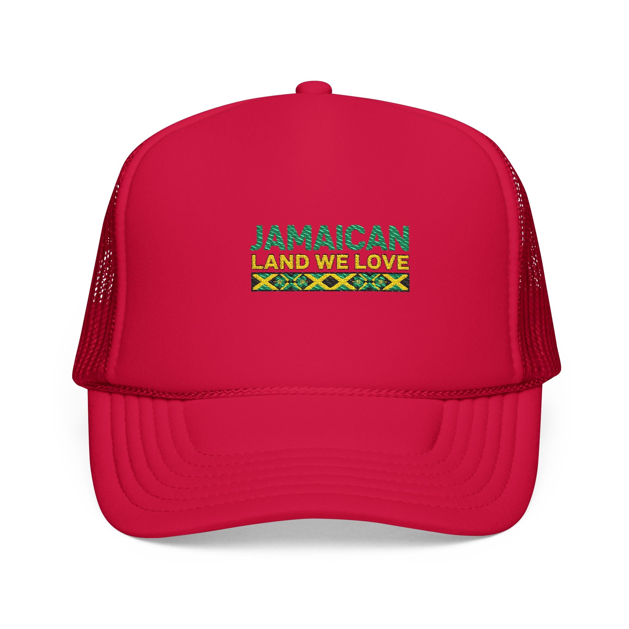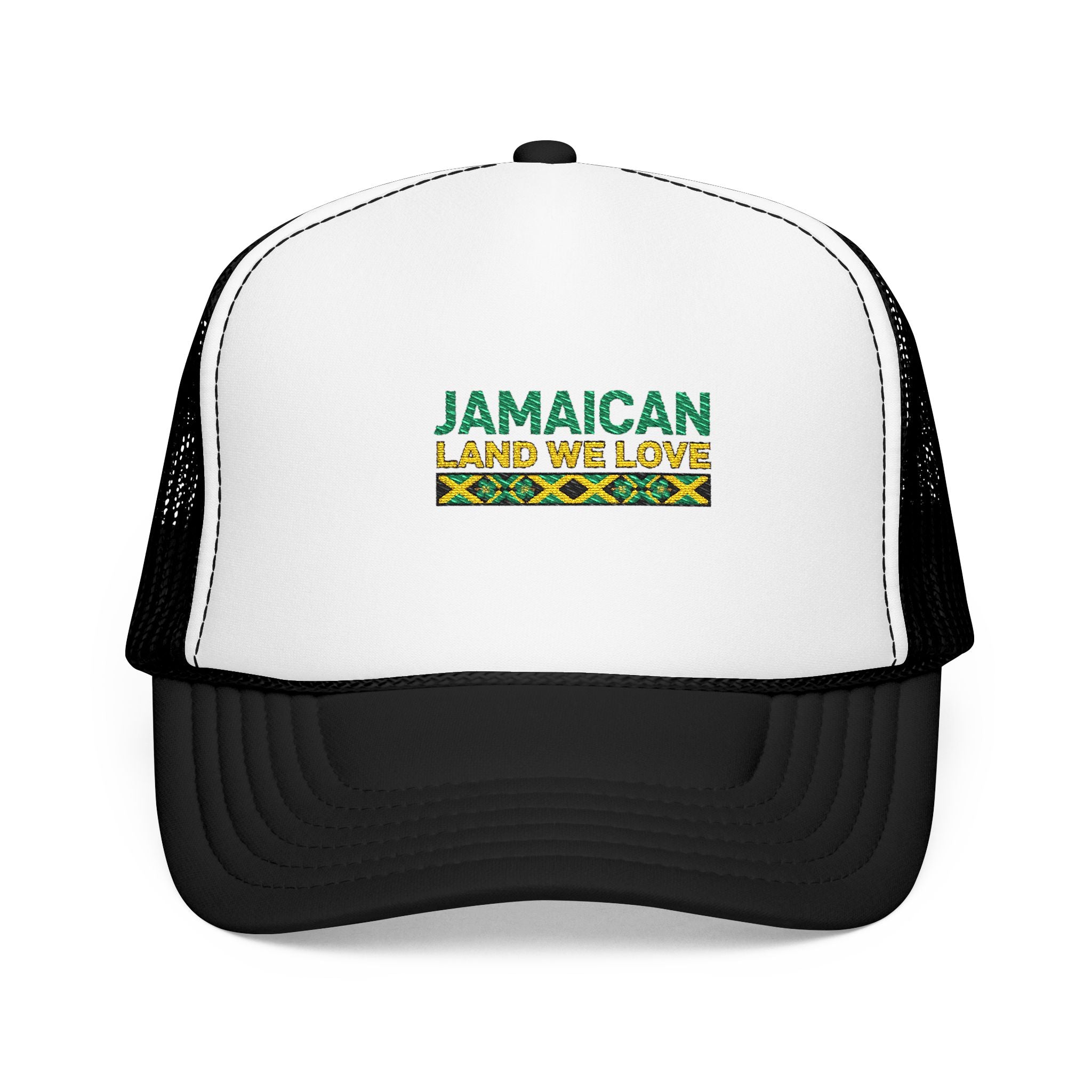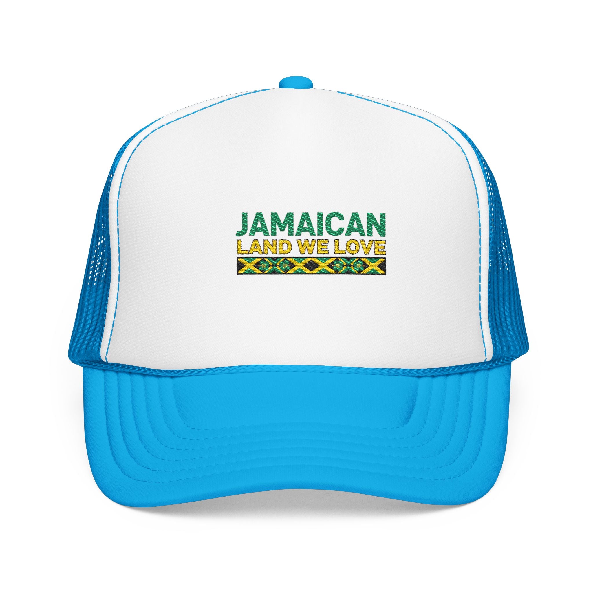 This foam trucker hat brings bright island energy to everyday wear. The structured, high-profile front showcases bold, embroidered lettering and a colorful patterned stripe that reads “Jamaican Land We Love,” while the ventilated mesh back keeps you cool when the sun is up. It sits confidently on the head thanks to a foam-laminated front panel and pre-curved visor with deep stitching, so the design stays crisp through repeated wear. The adjustable snapback lets you dial in a secure fit, and the substantial polyester fabric gives the hat a durable, premium feel that holds shape over time. Wear it on beach walks, neighborhood cookouts, reggae nights, or when you want to carry a touch of island pride with casual, lived-in style.