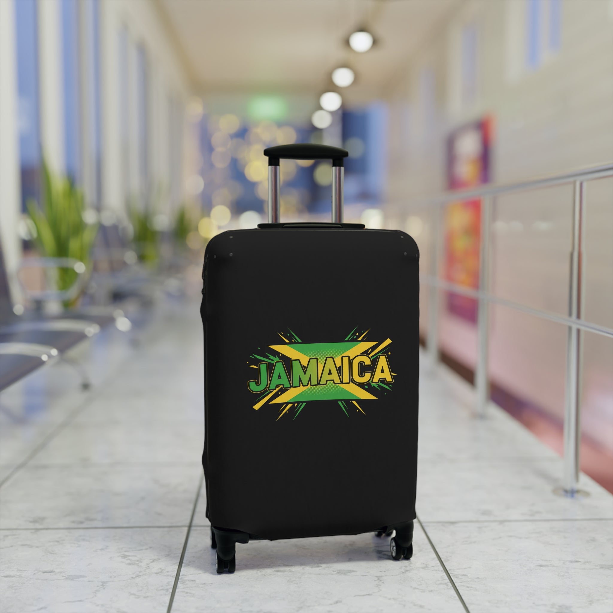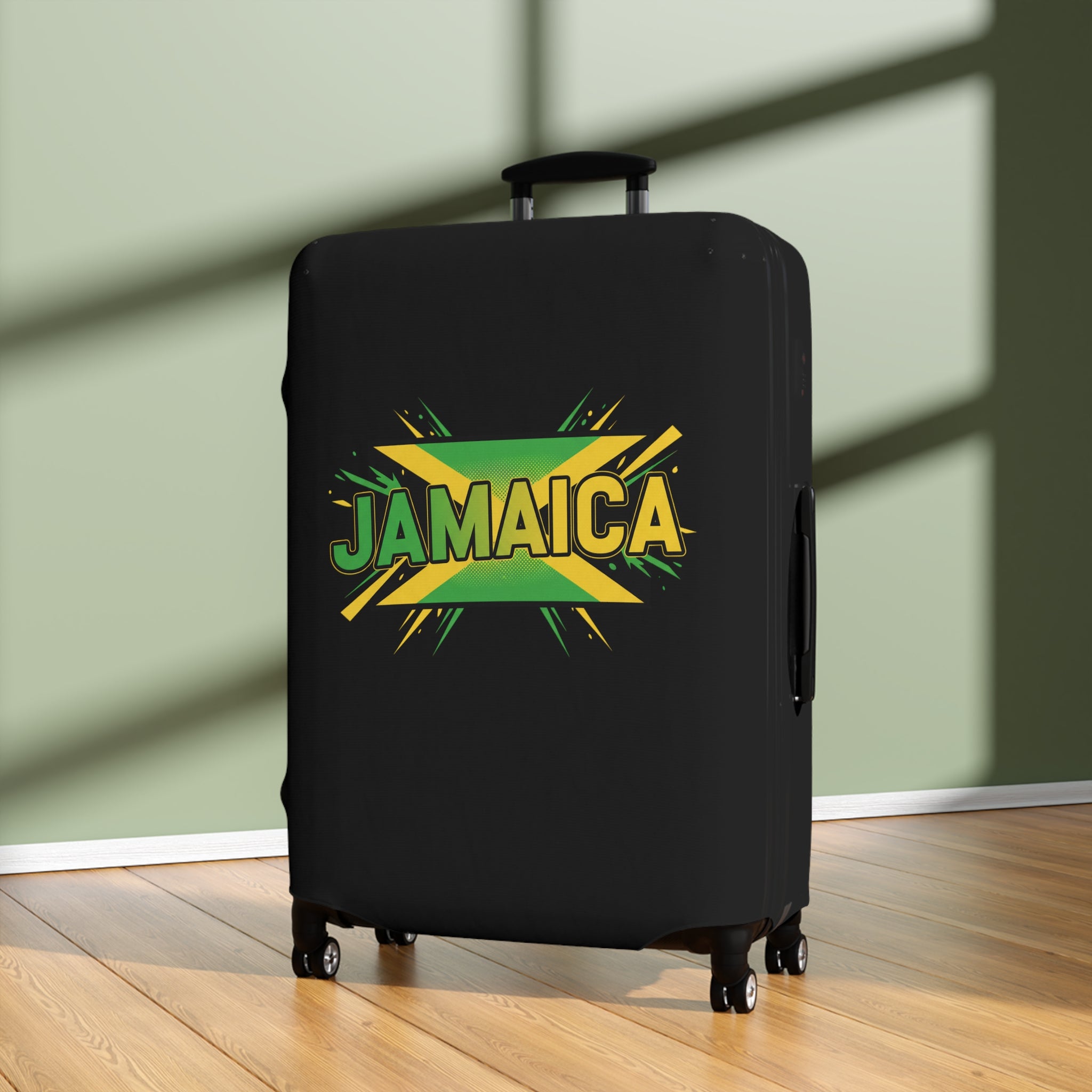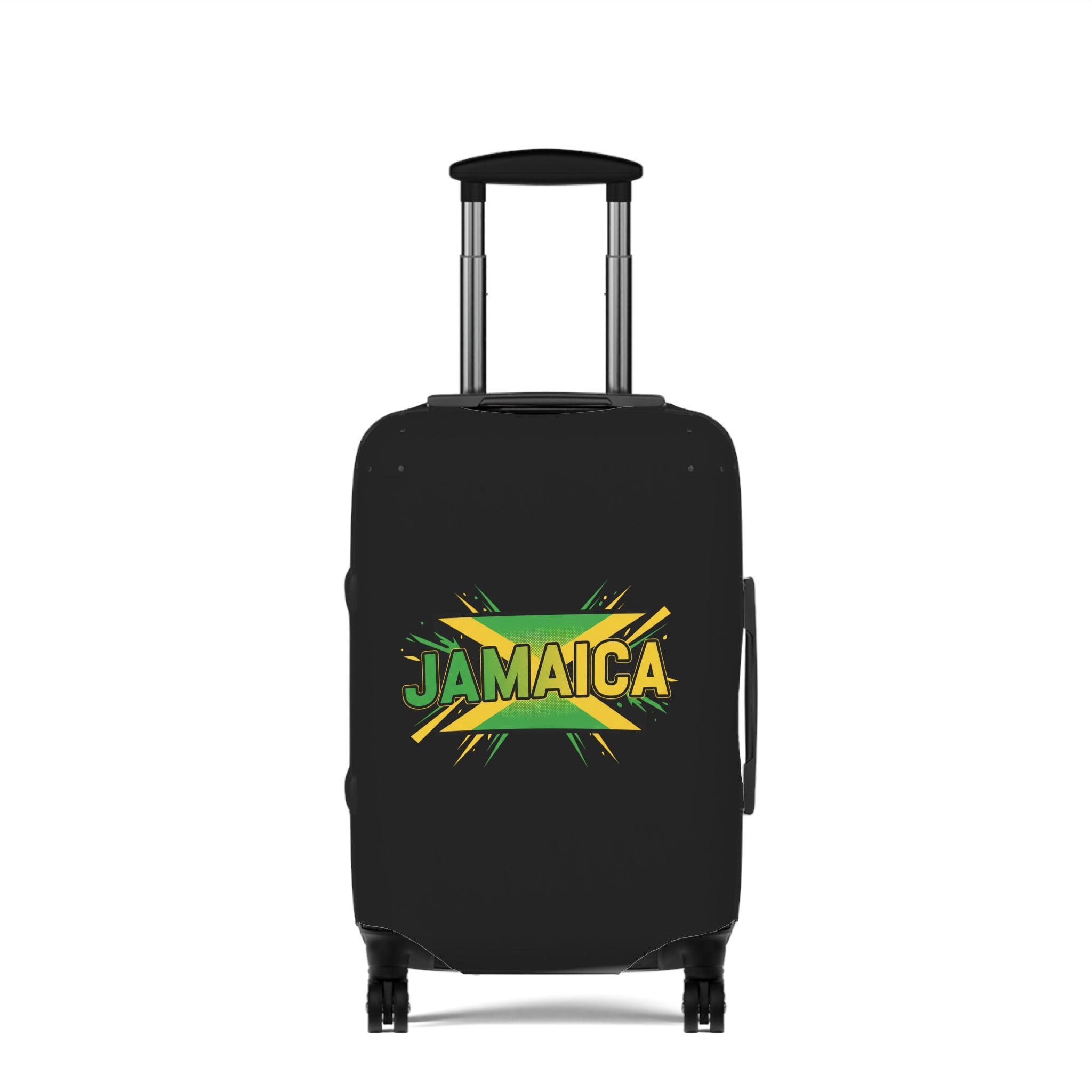 Carry the colors of the island wherever you roam. This stretchy luggage cover slips on easily and hugs your suitcase with a bold Jamaica graphic that pops against a deep black background. It keeps your bag cleaner, shields it from light scuffs and dust, and makes it unmistakable on crowded carousels. Lightweight and durable, the cover stretches over handles and zips closed at the base, giving quick access to top and side grips so you never sacrifice convenience for style. Bring a hint of sunlit beaches and island rhythm to every trip — a simple, cheerful way to travel with personality.