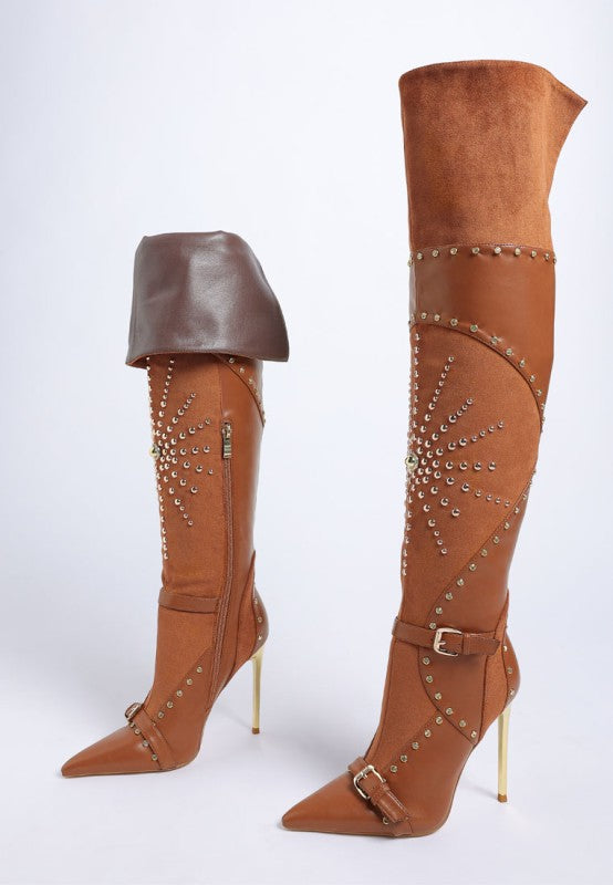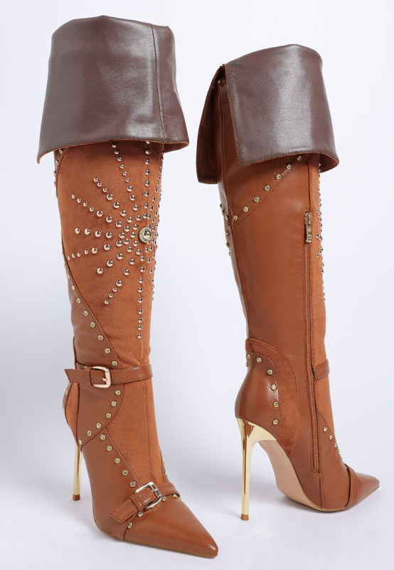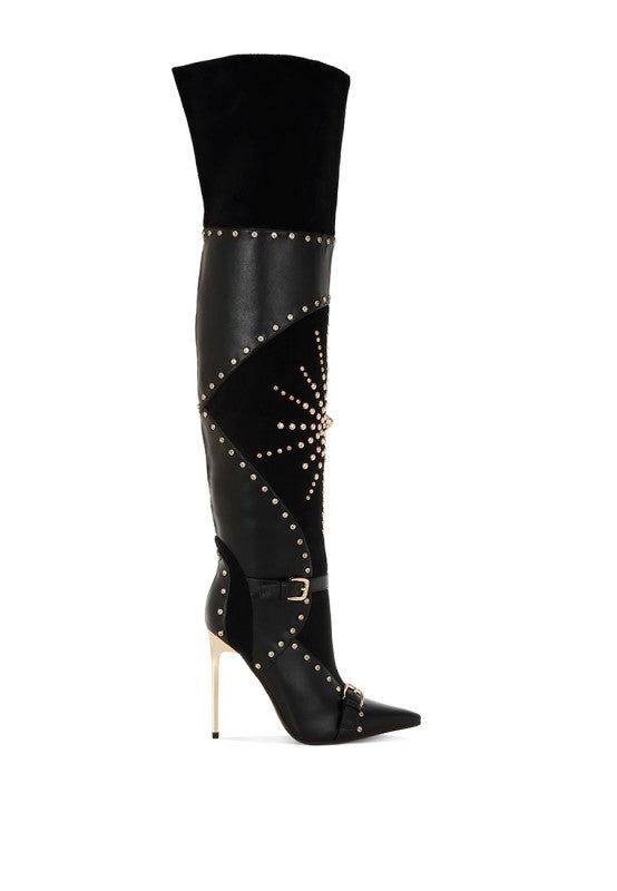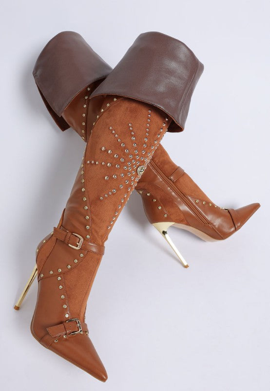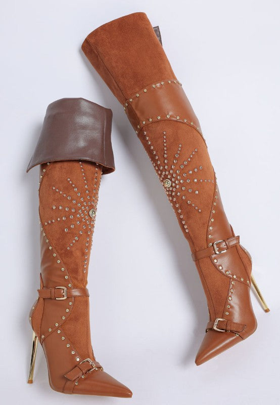 These pointed toe stiletto heel boots are a major statement-maker. The chic stud and diamante embellished motifs add an edgy appeal. Style these with a bodycon dress or a denim skirt and spaghetti top for a sundowner.