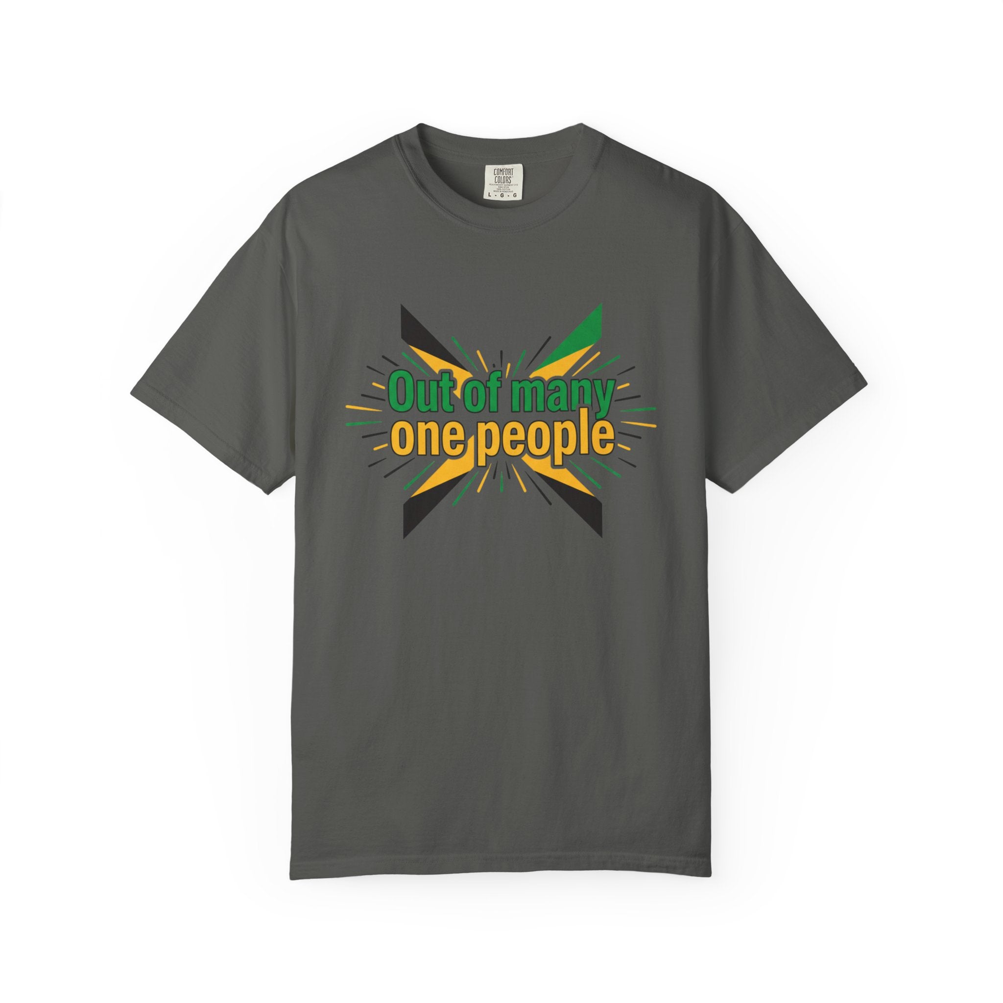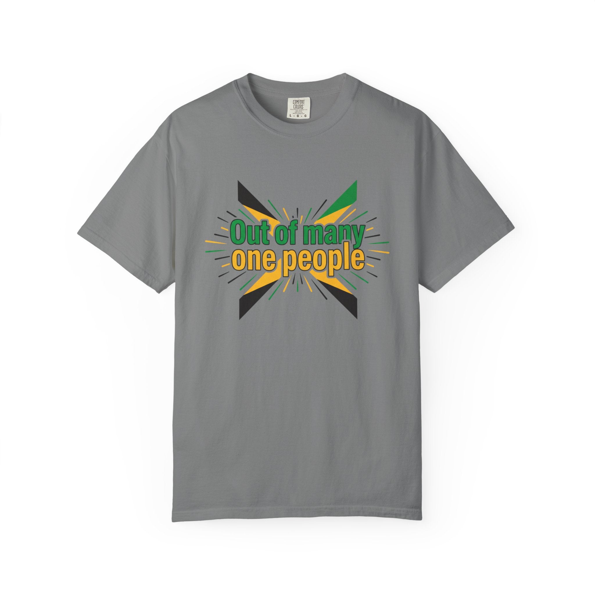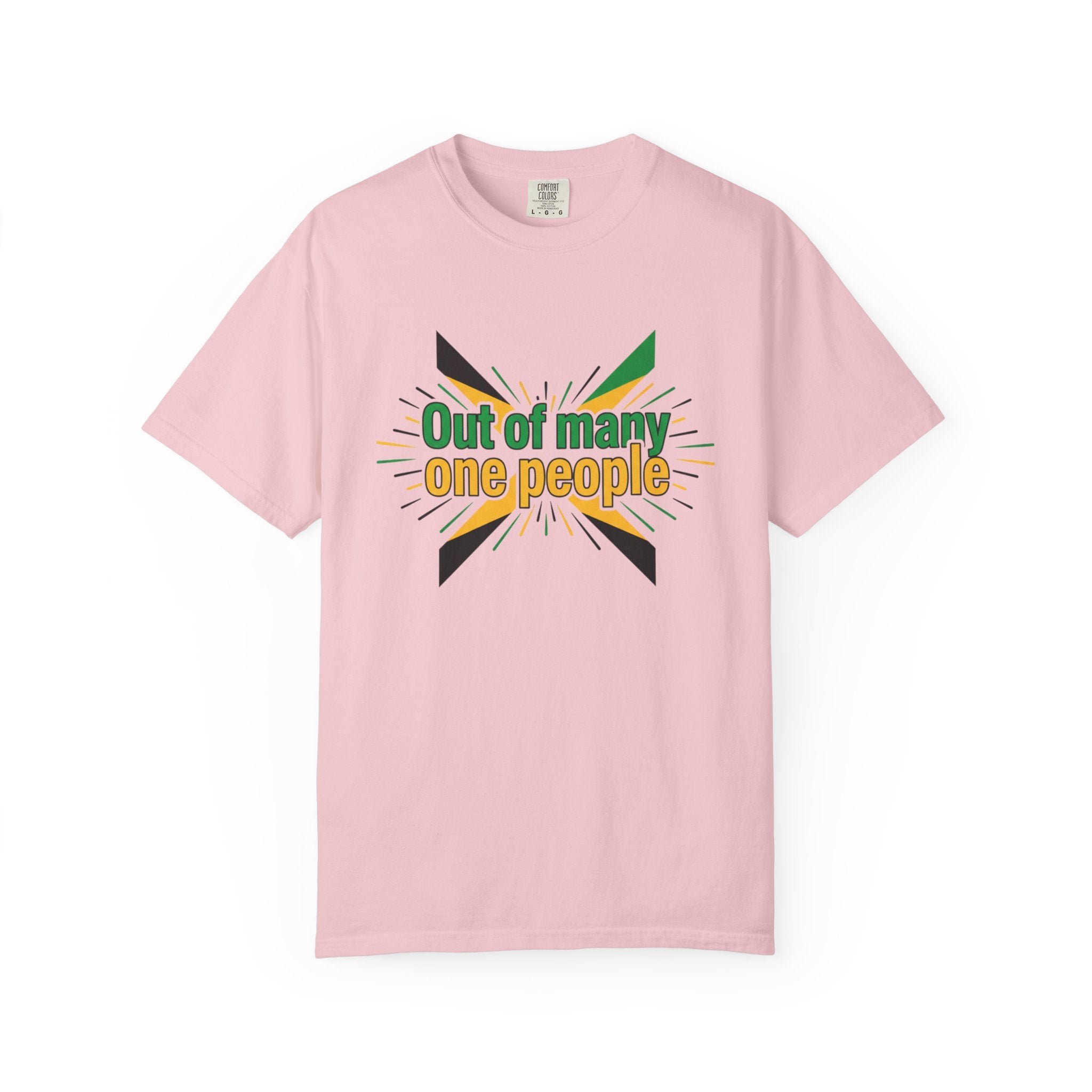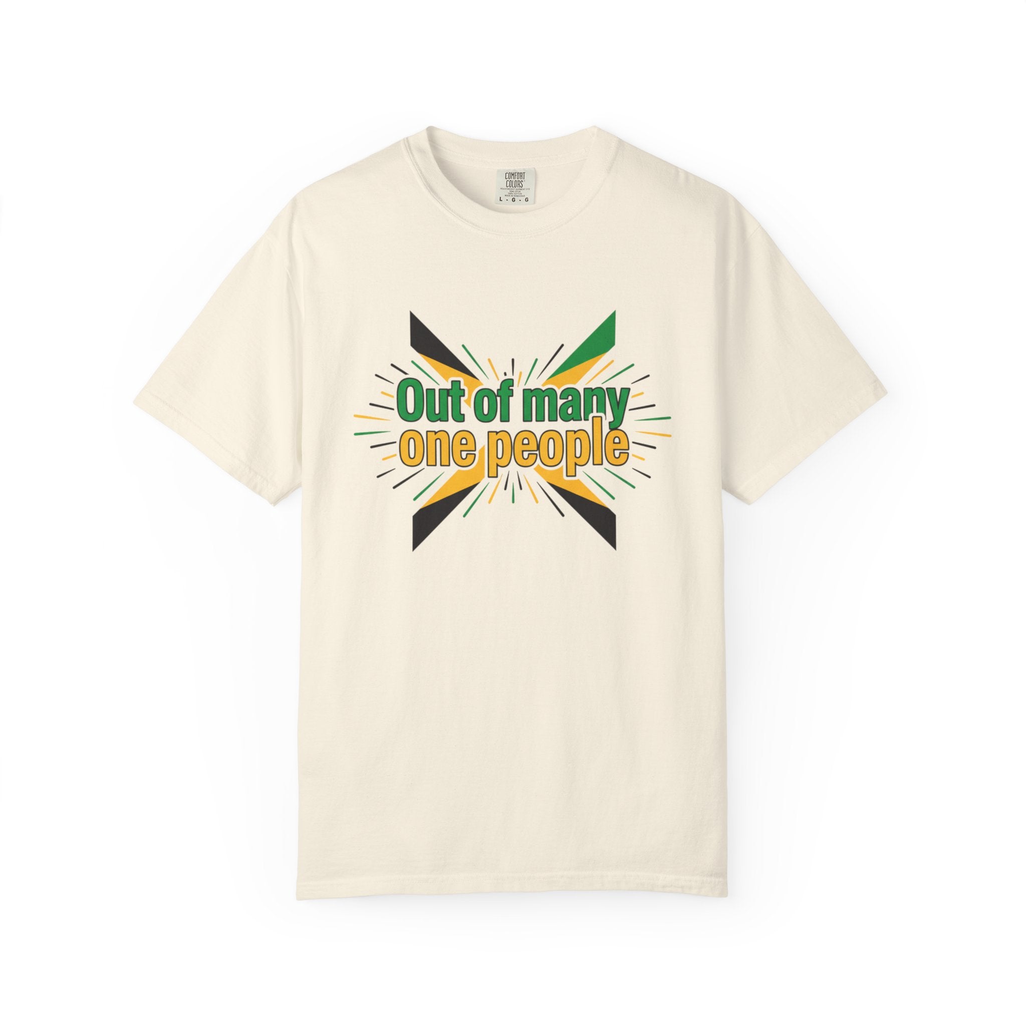 A soft, garment-dyed tee printed with a bright, proud message: “Out of many one people.” The design layers stylized flag colors and bold lettering that radiate from the center, giving the shirt a lively, celebratory energy. Lightweight yet substantial cotton and a relaxed cut make this shirt feel like an old favorite from the first wear. Wear it at community gatherings, cultural festivals, or casual days when you want to share a message of unity with understated confidence.